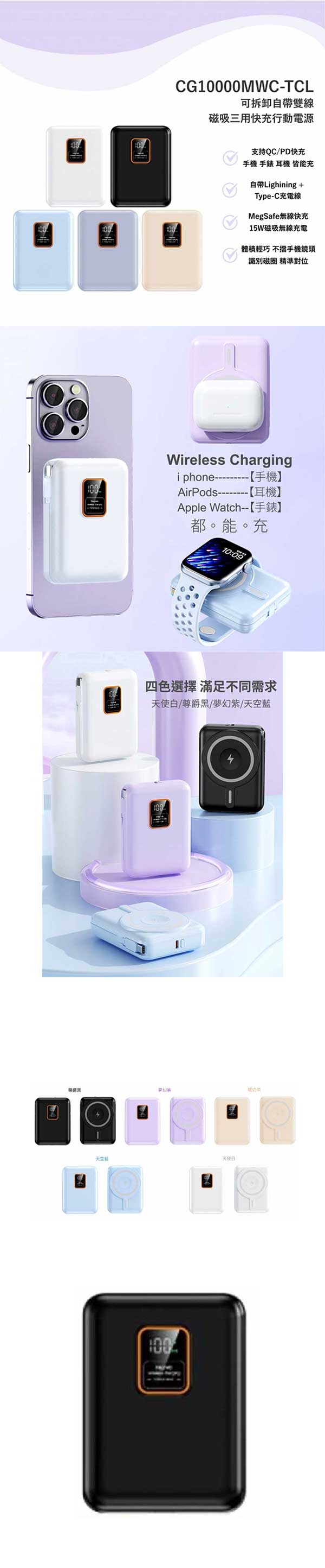 可拆卸自帶雙線磁吸三用快充行動電源